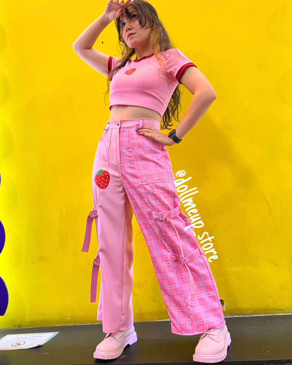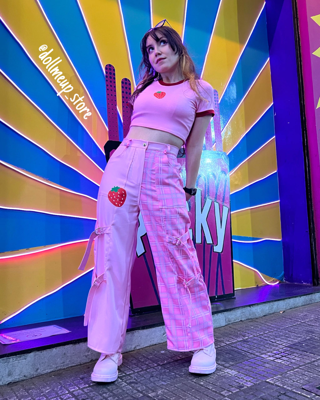 Se você procura uma calça que una conforto e todo o estilo kawaii, acaba de encontrar! Nossa calça jogger estilo wide leg vai capturar seu coração sem prender suas pernas. Com um toque único, possui detalhes em ilhós nas laterais para um charme extra, além de um bolso fundo que acomoda tudo o que você precisar e uma estampa fofa de morango que vai te encantar <3.