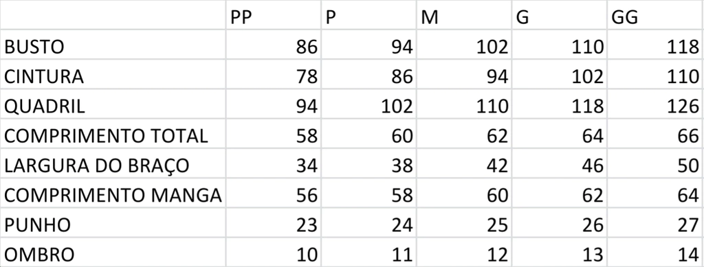 - GG: Busto: 118 cm | Cintura alta: 110 cm | Braço: 50 cm | Comprimento: 66 cm
