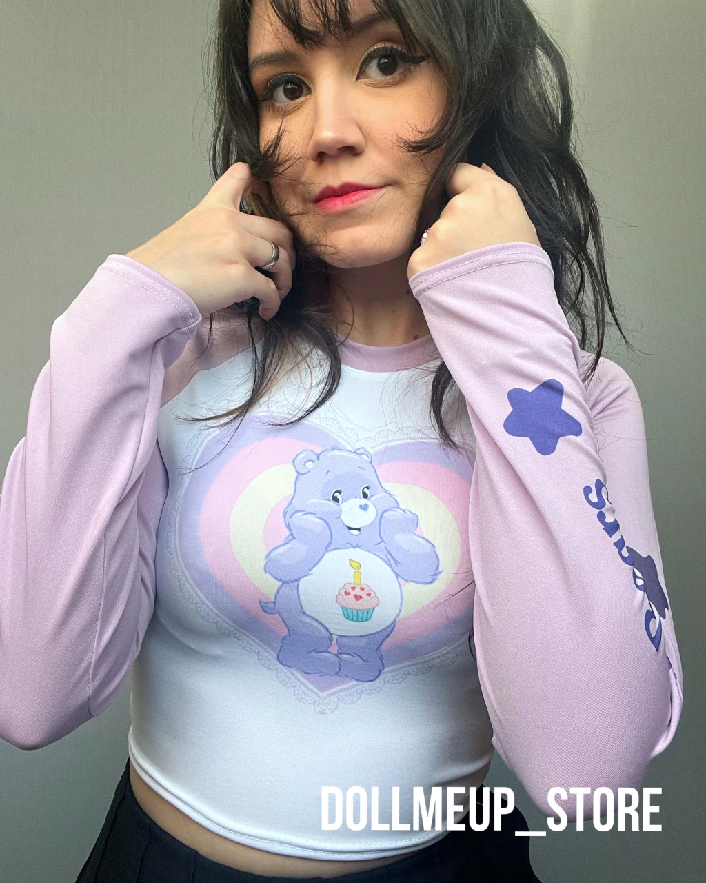 A vibe Y2K está de volta com os ursinhos mais amados da infância! Cropped branco com mangas longas estilo raglan na cor lilás e estampa exclusiva dos Care Bears, perfeito para quem ama um toque nostálgico e super kawaii no look <3