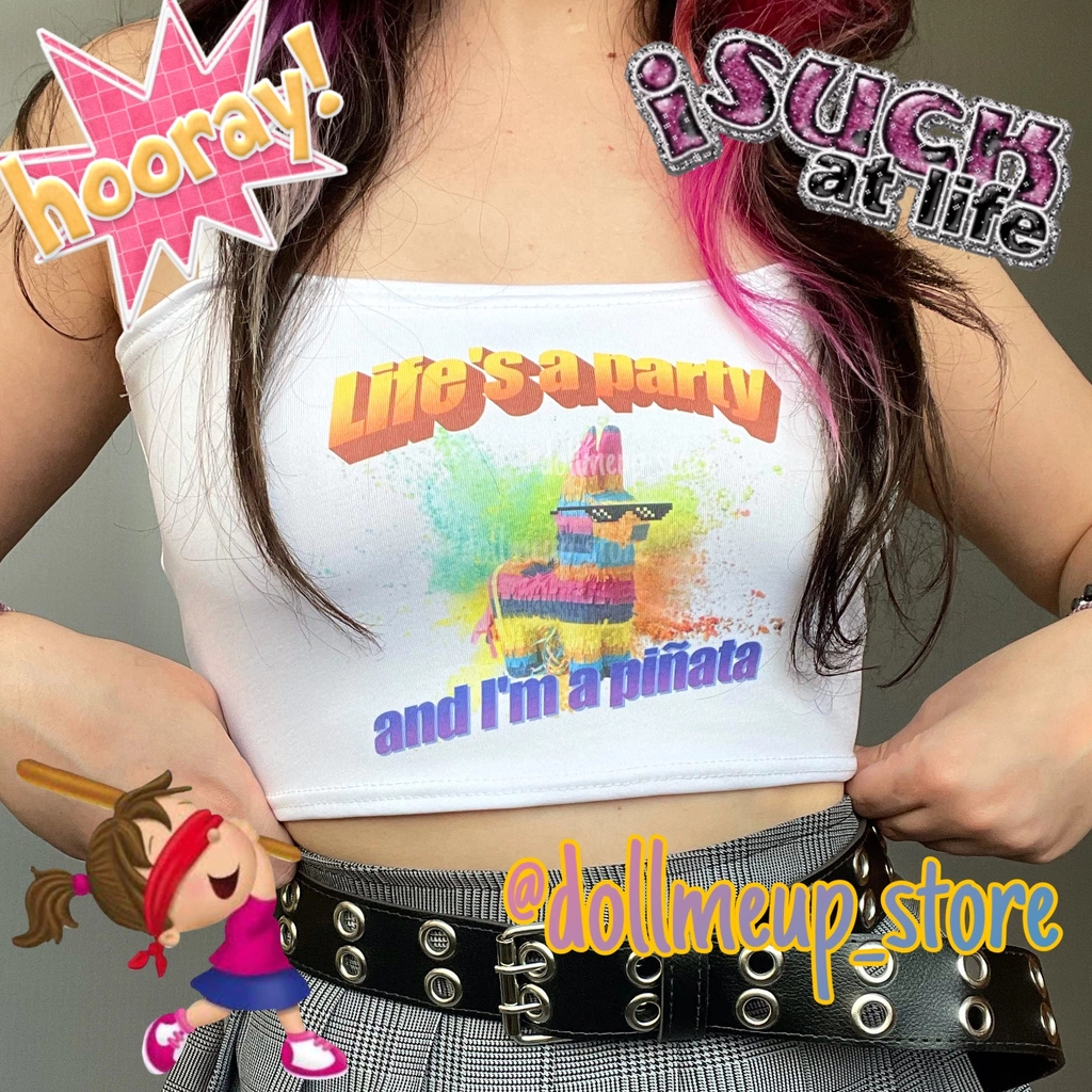 Este cropped exclusivo, com a frase divertida: "A vida é uma festa e eu sou uma piñata", faz parte da coleção Y2K "Bring my 2000's back", criada em parceria com @alybubbly, autora da estampa. Perfeito para quem ama peças descoladas com um toque de humor irônico e nostálgico.