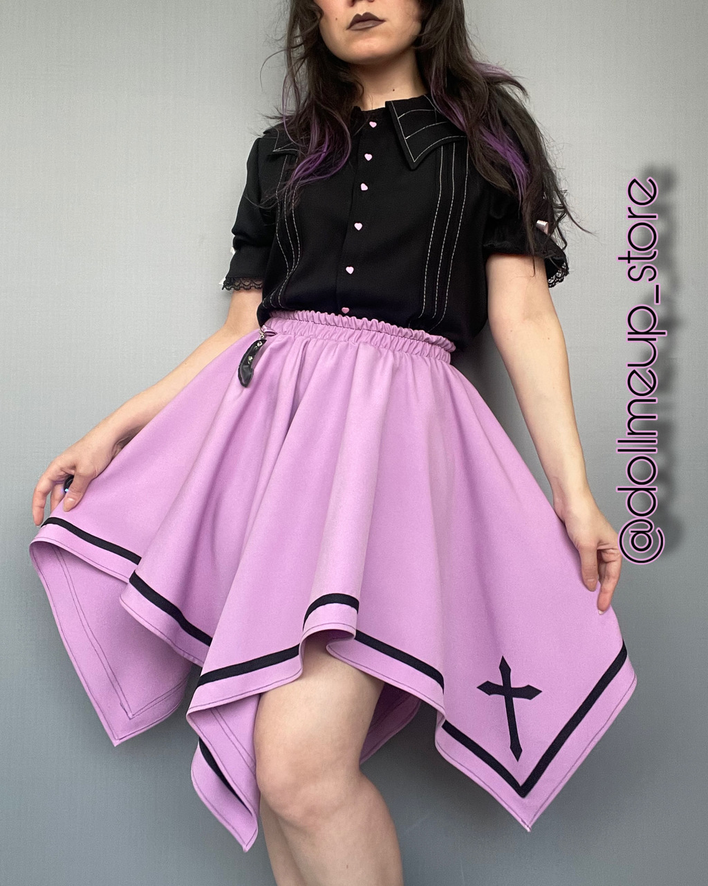 A Saia Cruz Lilás combina o corte assimétrico de caimento fluido com o detalhe da cruz em barra dupla, criando o equilíbrio perfeito entre o dark e o delicado.